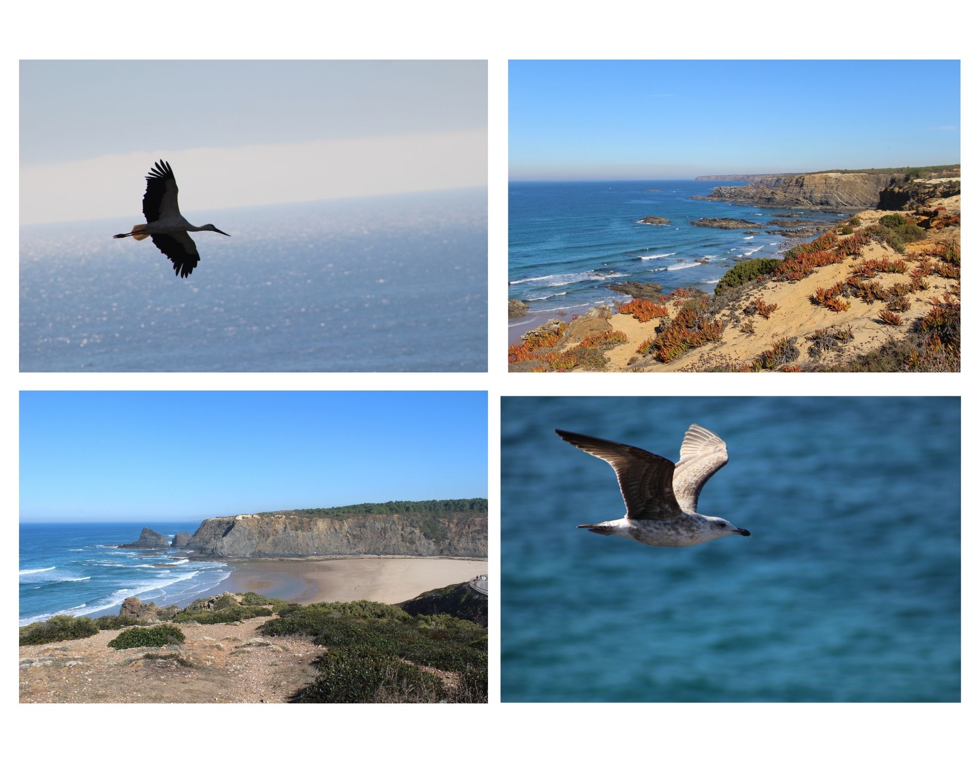Il y a une heure de décalage entre les deux pays. Mais, je reste à l'heure française. Je pars vers le nord, à la limite du parc naturel, qui démarre à Sines. La plage de Samoqueira, sur la belle route vicentine, est dénaturée, au nord, par la centrale thermo-électrique, désormais fermée, de Sines. Ce bel endroit préservé me fait penser à la côte bretonne. Plus au sud, le petit village tout aussi endormi de Porto Covo semble compter parmi ses habitants que quelques oiseaux : goélands, cormorans, moineaux et mésanges. Pour faire face à l'impressionnante et immense plage de Malhao, la voiture doit avaler 3 kilomètres d'une piste non bitumée et cabossée qui la macule de poussière. Le soir venu, il est agréable de se promener dans le petit village de Vila Nova de Milfontes. Le sentier côtier sablonneux est sympa malgré la petite fraîcheur automnale.
